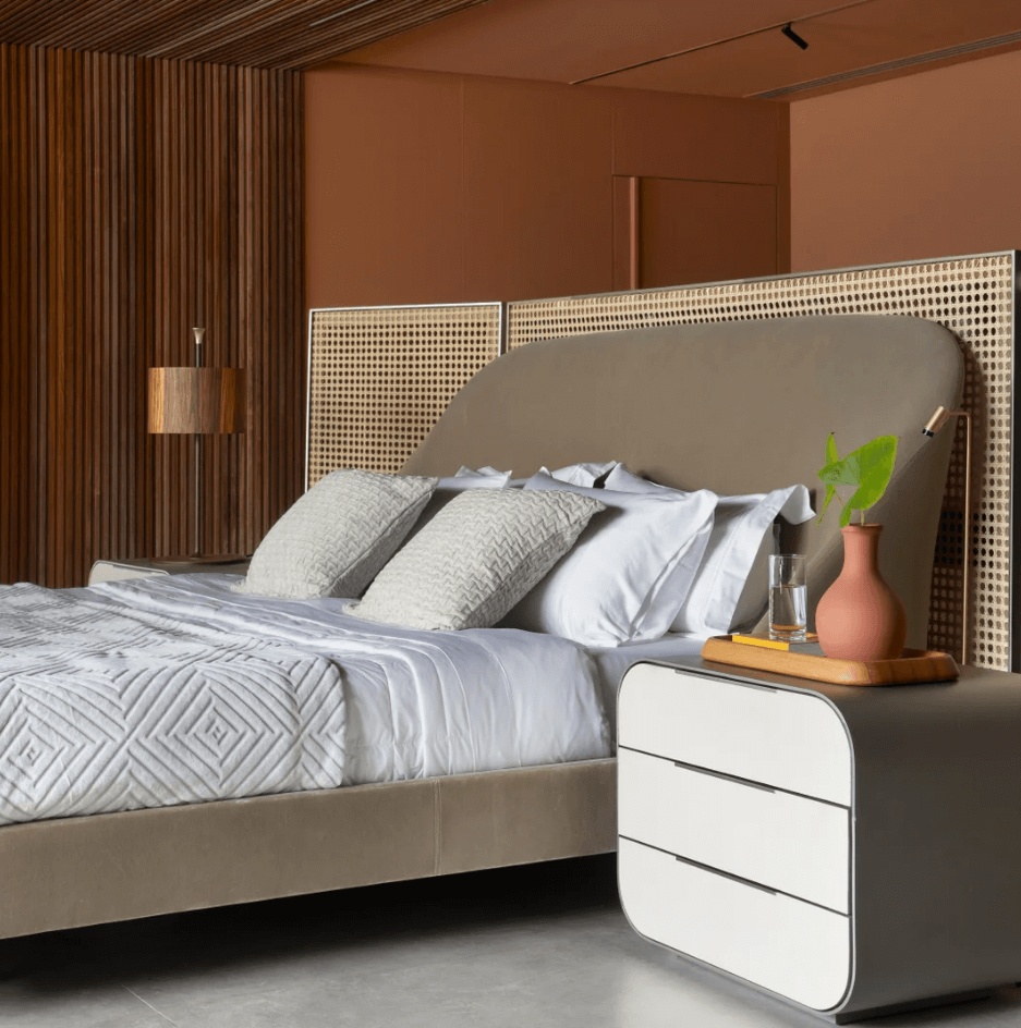 A cama costuma ser o elemento de maior volume e geralmente apresenta linhas retas. Cabeceiras estofadas com cantos arredondados, mesas de apoio em formatos curvos e luminárias circulares contribuem para um visual mais suave no quarto, adequado à função de descanso do ambiente.